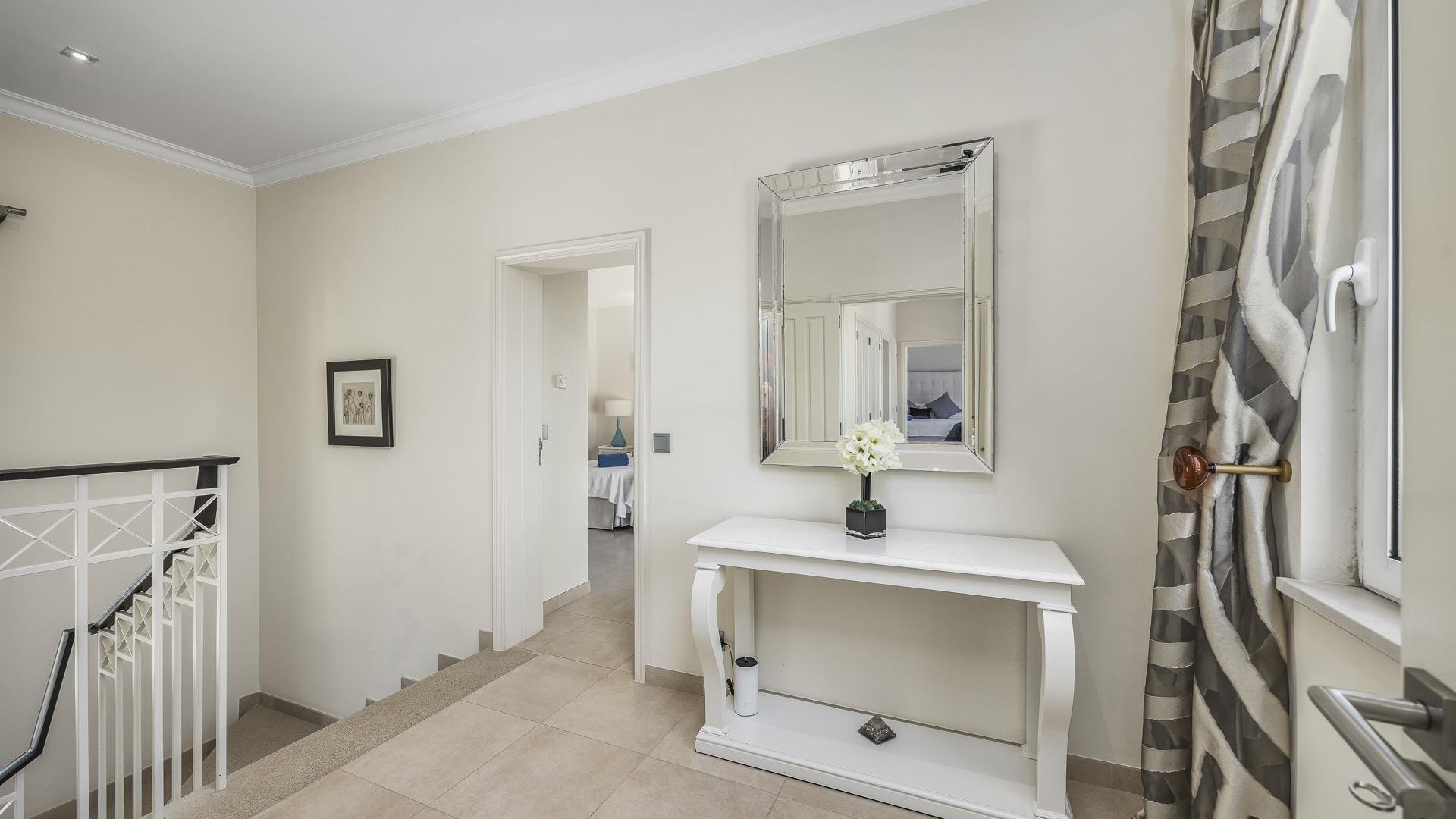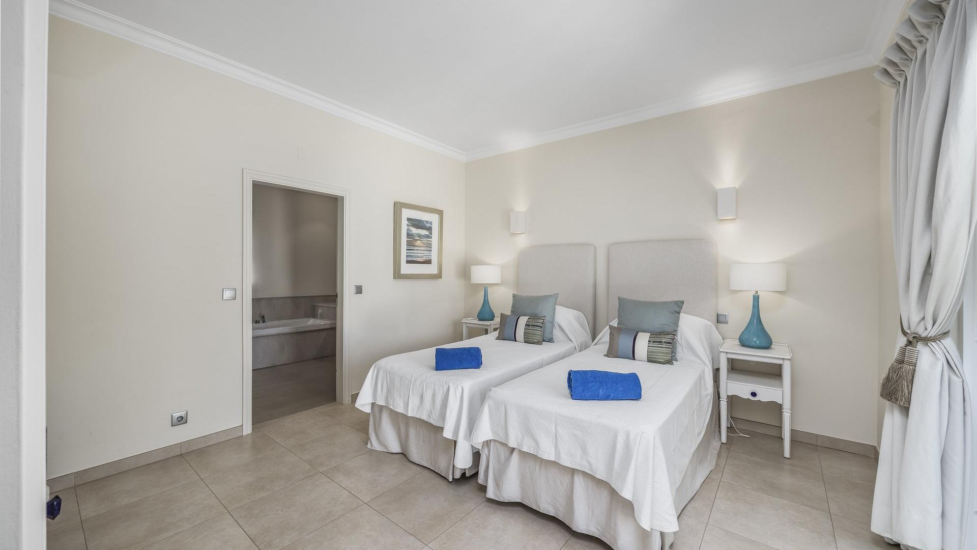Upstairs, you will find 2 further bedrooms. The master bedroom has a super king size bed with TV and private balcony overlooking the pool. The en-suite bathroom is a full bathroom with both tub and shower. The second bedroom upstairs has two twin beds as well as a full en-suite bathroom with shower and tub. This bedroom also has an enclosed private balcony.