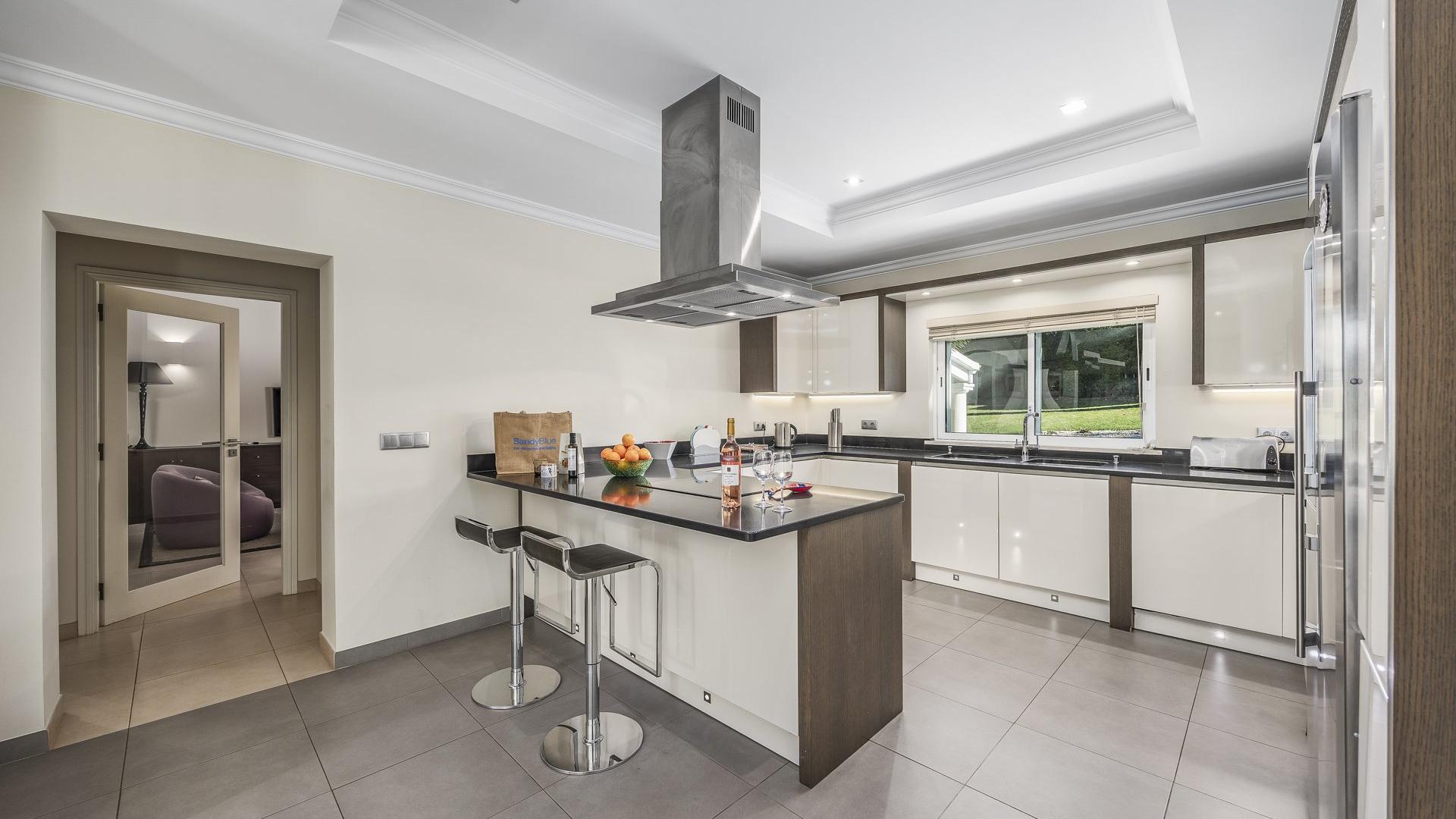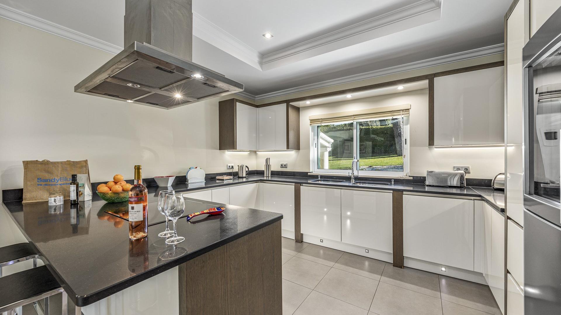 It has a fridge & freezer, a wine cooler, extractor, Nespresso coffee machine, ground coffee machine, kettle, oven, toaster, dishwasher, blender, juicer and an electric hob |
