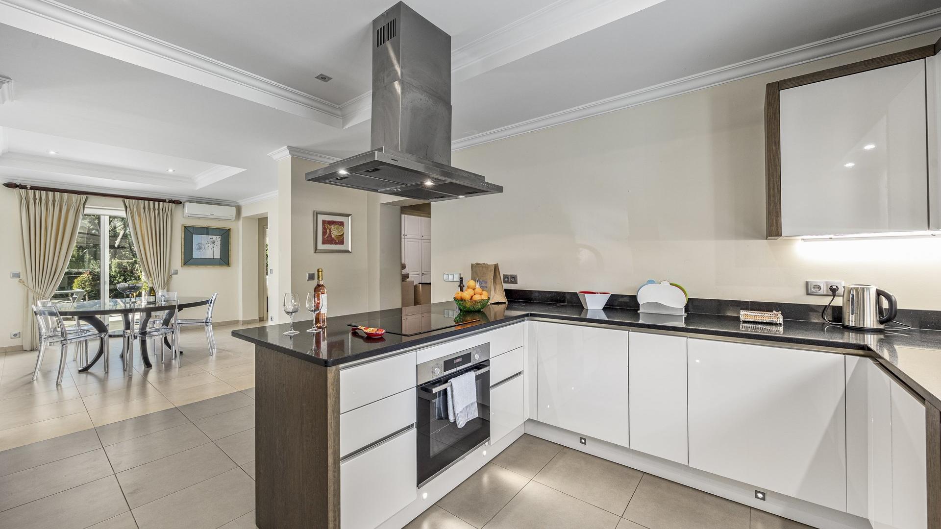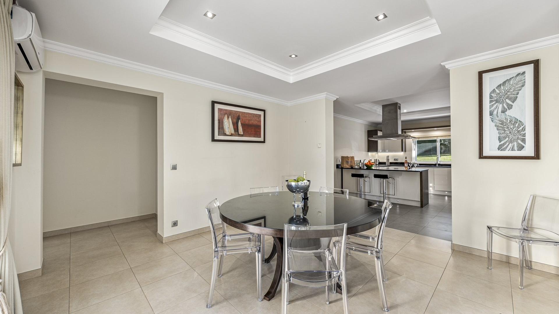 Inside Villa Bondade, the modern décor and luxury furnishings will make for a very comfortable stay. The open plan design means lots of space and natural light pouring through the villa. The living room/lounge has a large corner sofa and a very large TV with Lazer system. The indoor dining table is also in this open plan space and is great for evening family meals.